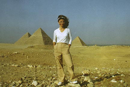 Linda Moulton Howe in Cairo, Egypt, on the Giza plateau where the great Cheops pyramid rises with its companions, Kephren and Mykerinos.